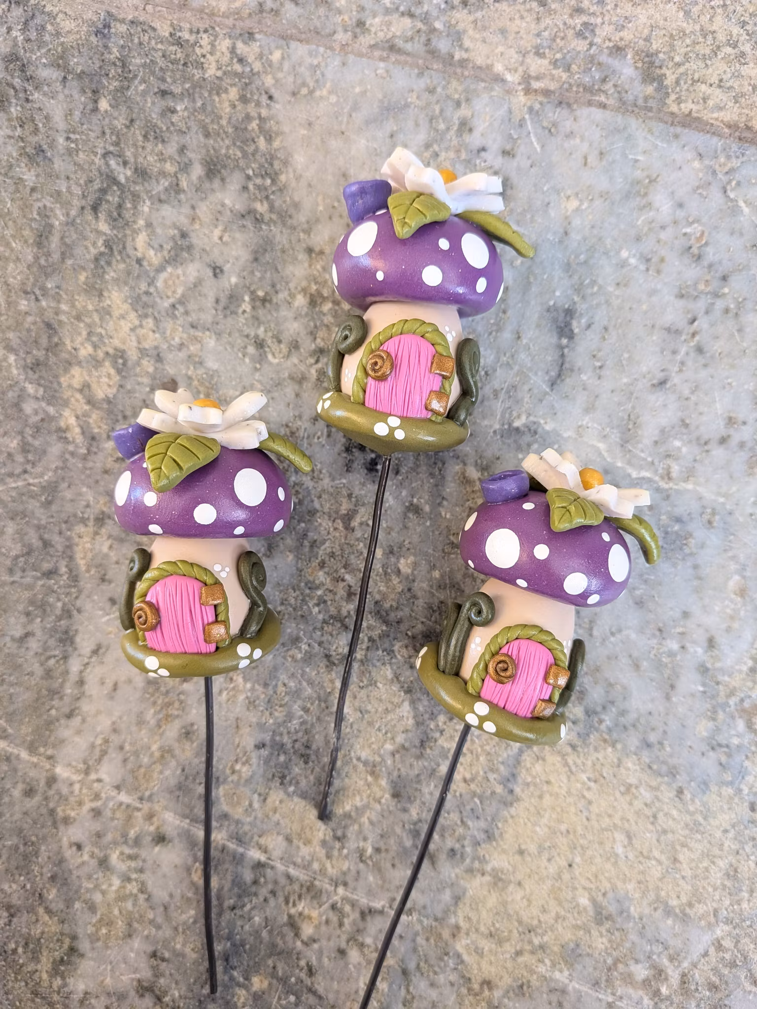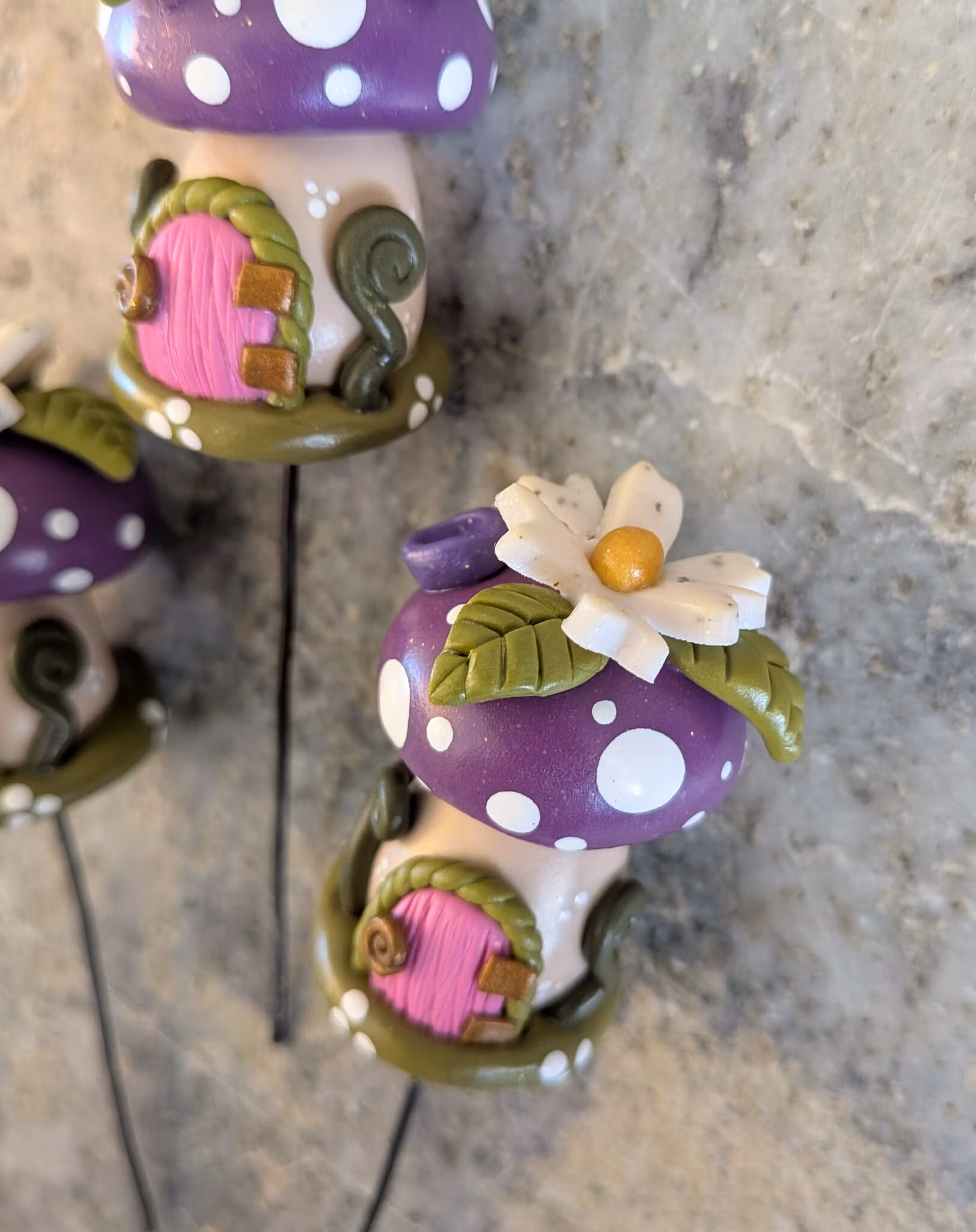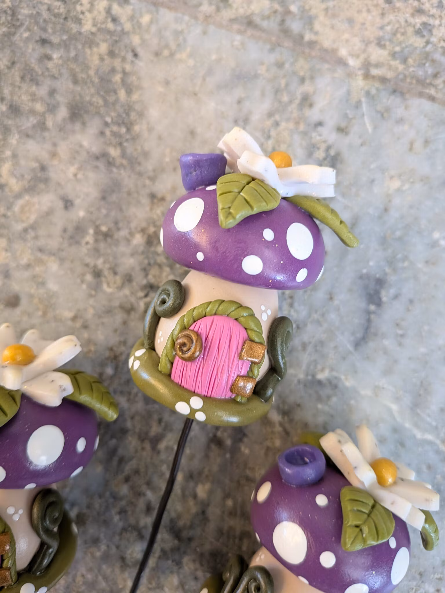 Gulligt nissehus, svamp med vit blomma, med metallpinne som ska stickas ner i en blomkruka