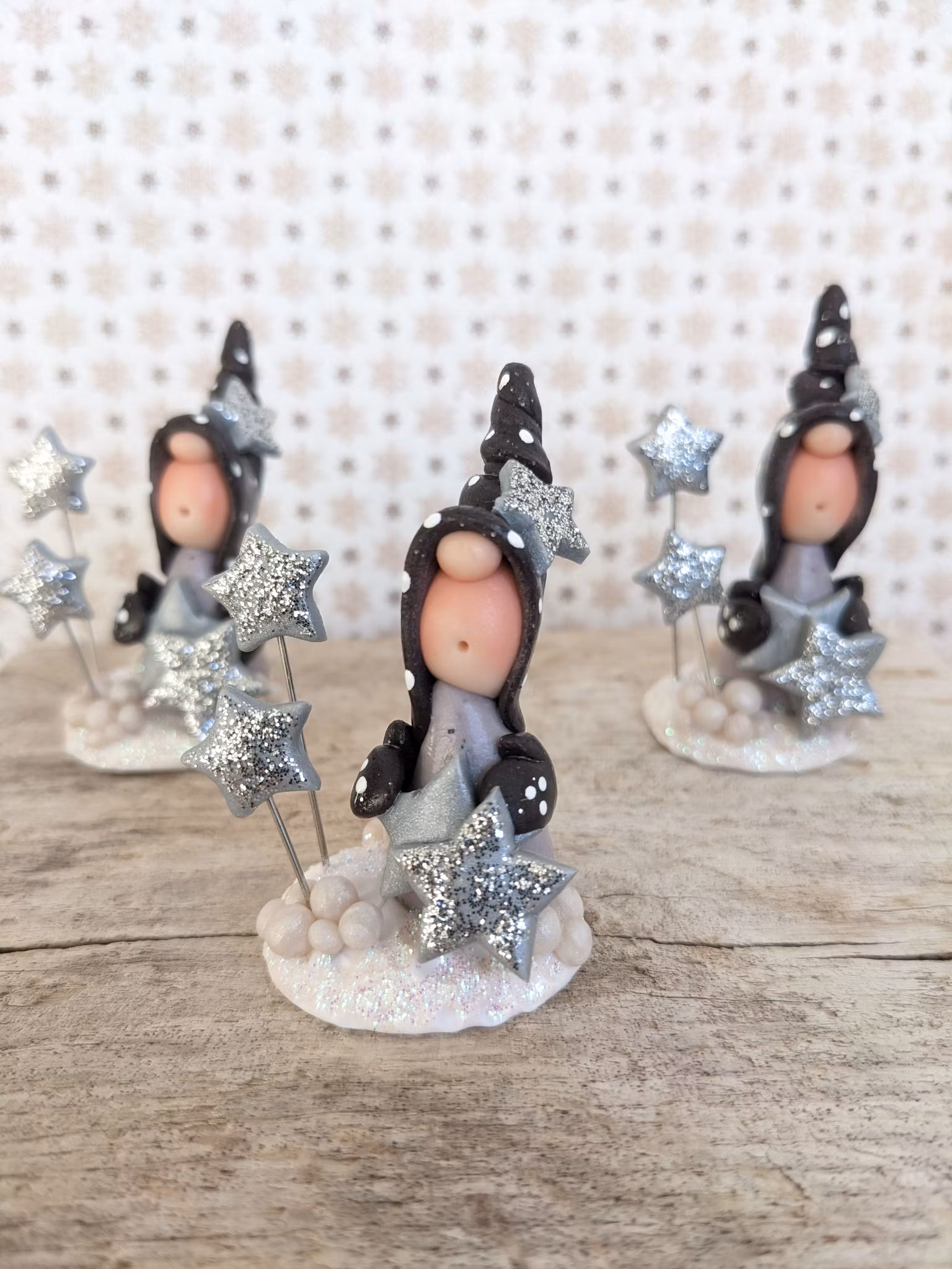 Fristående Nisse- 'Nyårsfest" Produkten är tyvärr slut i lager. :( Liten fristående nisse md glittriga stjärnor och snöHöjd: ca 6 cmPriser gäller för EN nisseAlla produkter är handgjorda och små variationer kan förekomma
