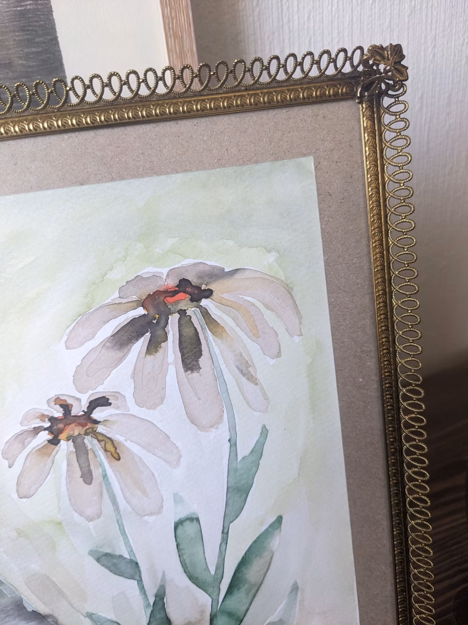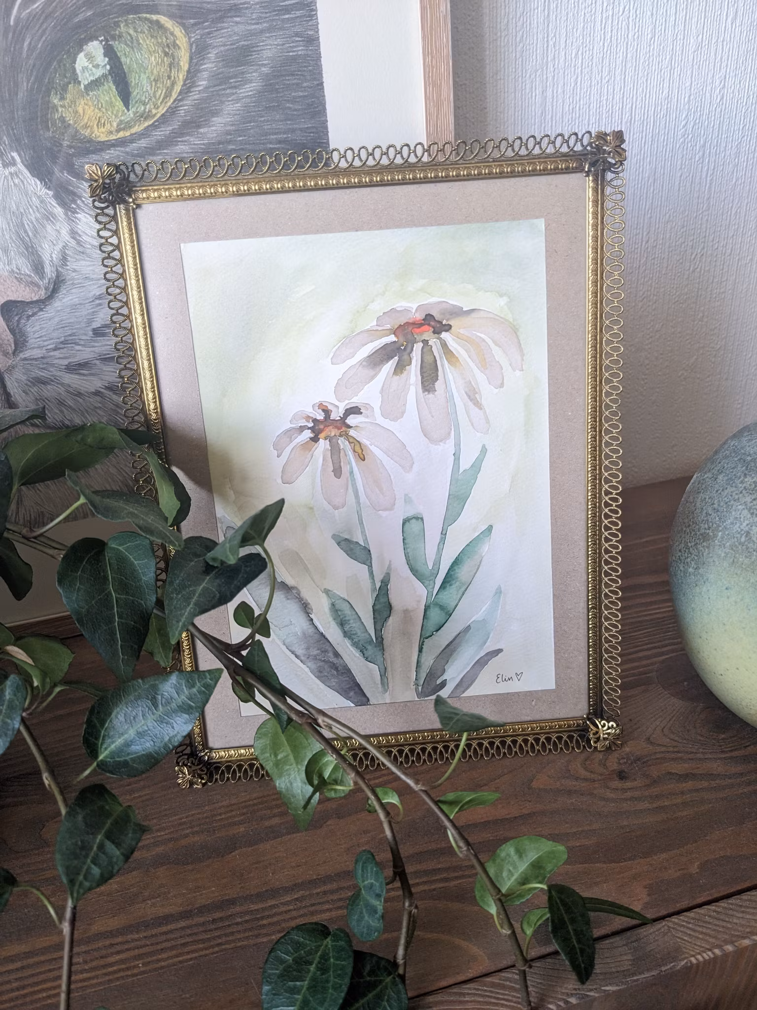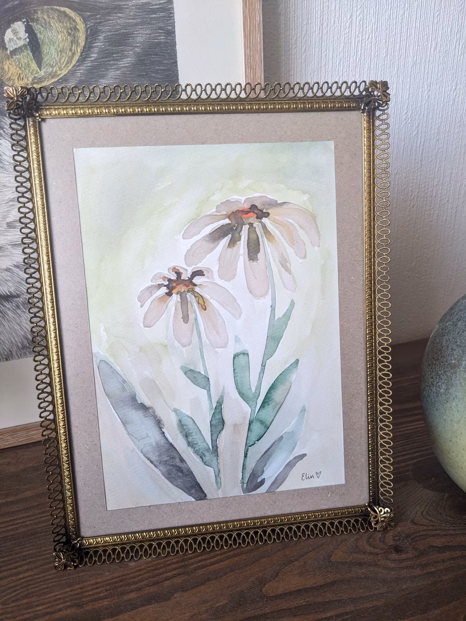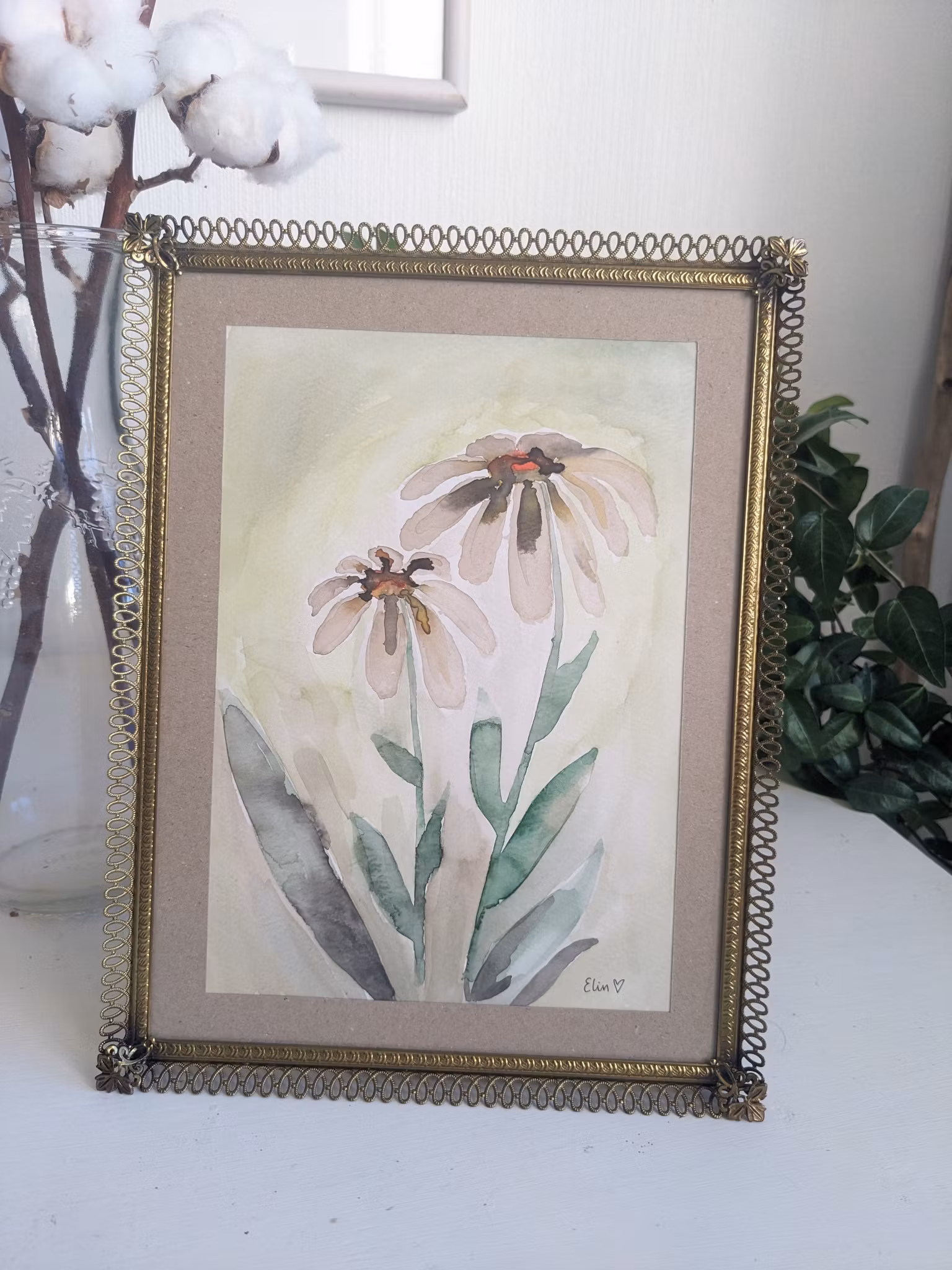 Inramad Akvarell- Prästkragar Produkten är tyvärr slut i lager. :( Original-akvarell inramadStorlek ca 20x26cmRamen är en äldre variant med reflex fritt antikt glas